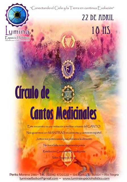 | Posted: 18 Apr 2017 07:35 AM PDT Sábado 22 de abril a las 18hs en Lumina Espacio Holistico. Perito Moreno 2186. Este encuentro es una invitación a meditar a través del canto, por medio del corazón. Recordando lo hermoso de sentarnos en círculo, despertamos nuestra memoria ancestral y anclamos el estado presente meditando con todo lo que somos. Dejamos salir el sonido juntos experimentando el bienestar de hacerlo y viajamos a través de cantos sagrados que nos guían y nos contienen desde adentro. La repetición de un mantra es una vibración que disuelve la oscuridad activando lo luminoso de nuestro espíritu. No hace falta tener experiencia previa, simplemente precisamos entregarnos para transformarnos. Retribución conciente - No excluyente Sugerido $ 150 Guia: Sol - Instructora de yoga y cantora | ||